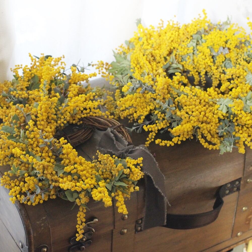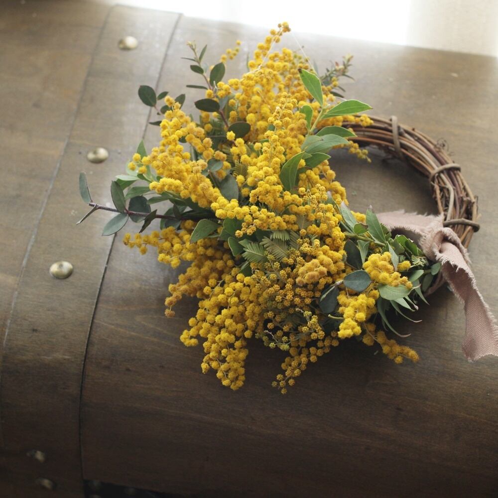 春に人気のミモザやユーカリグリーンなど、ドライフラワーに人気のお花たちでリースを作りました。