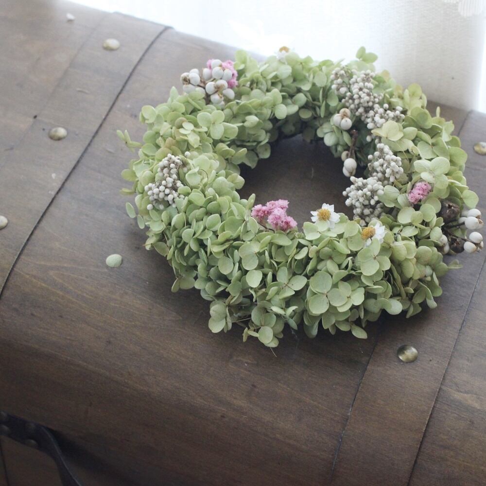 季節のアナベルアジサイや小花のドライフラワーなどで制作いたします。