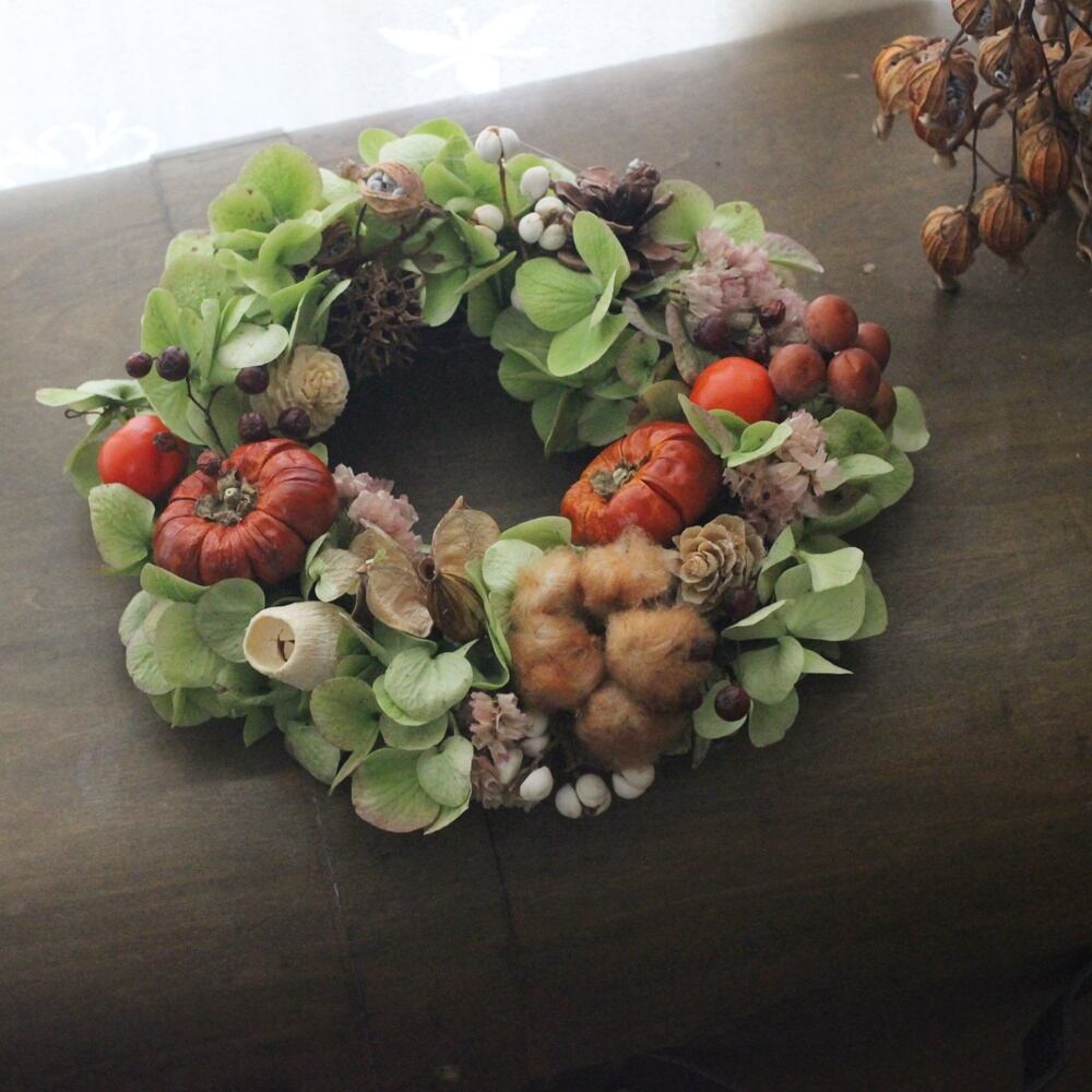 パンプキンみたいなソラナムを入れて、秋のリースを作りました。
