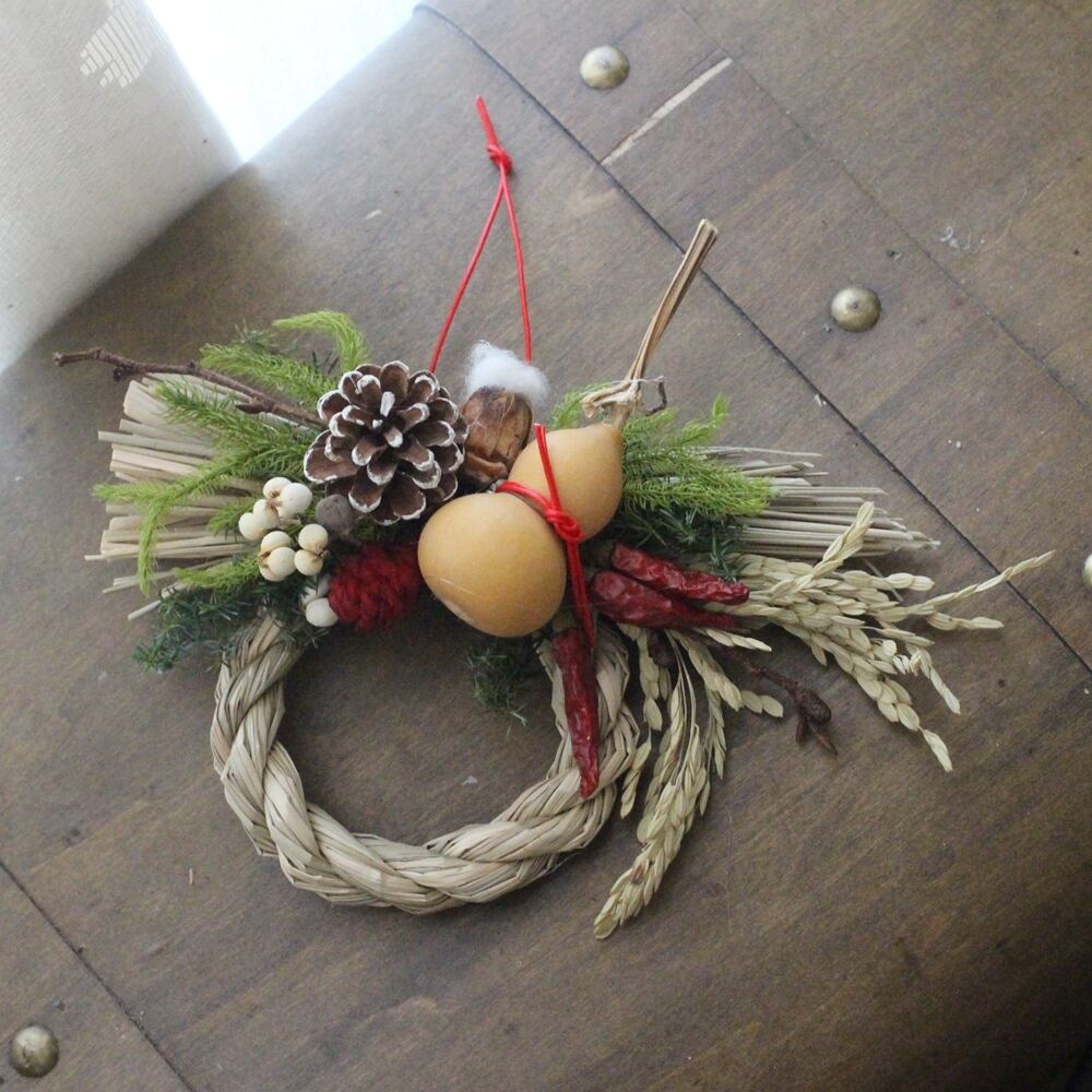 ひょうたんの入ったナチュラルでかわいいデザインのしめ縄飾り。